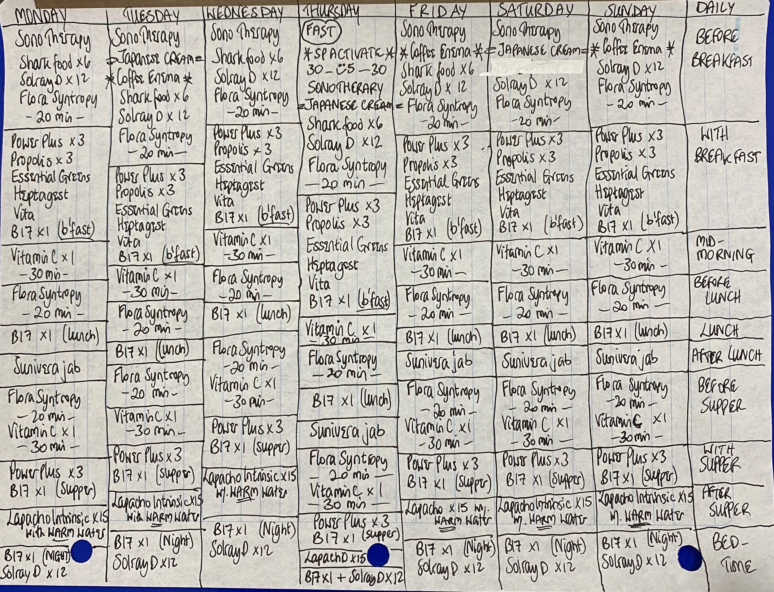Getting the above plan made out as a weekly schedule to keep me right and take some of the mental pressure off running HTP and also trying to do something else (other than nap!). This schedule does not include all the treatments, nor the menu plan for each day’s meals.