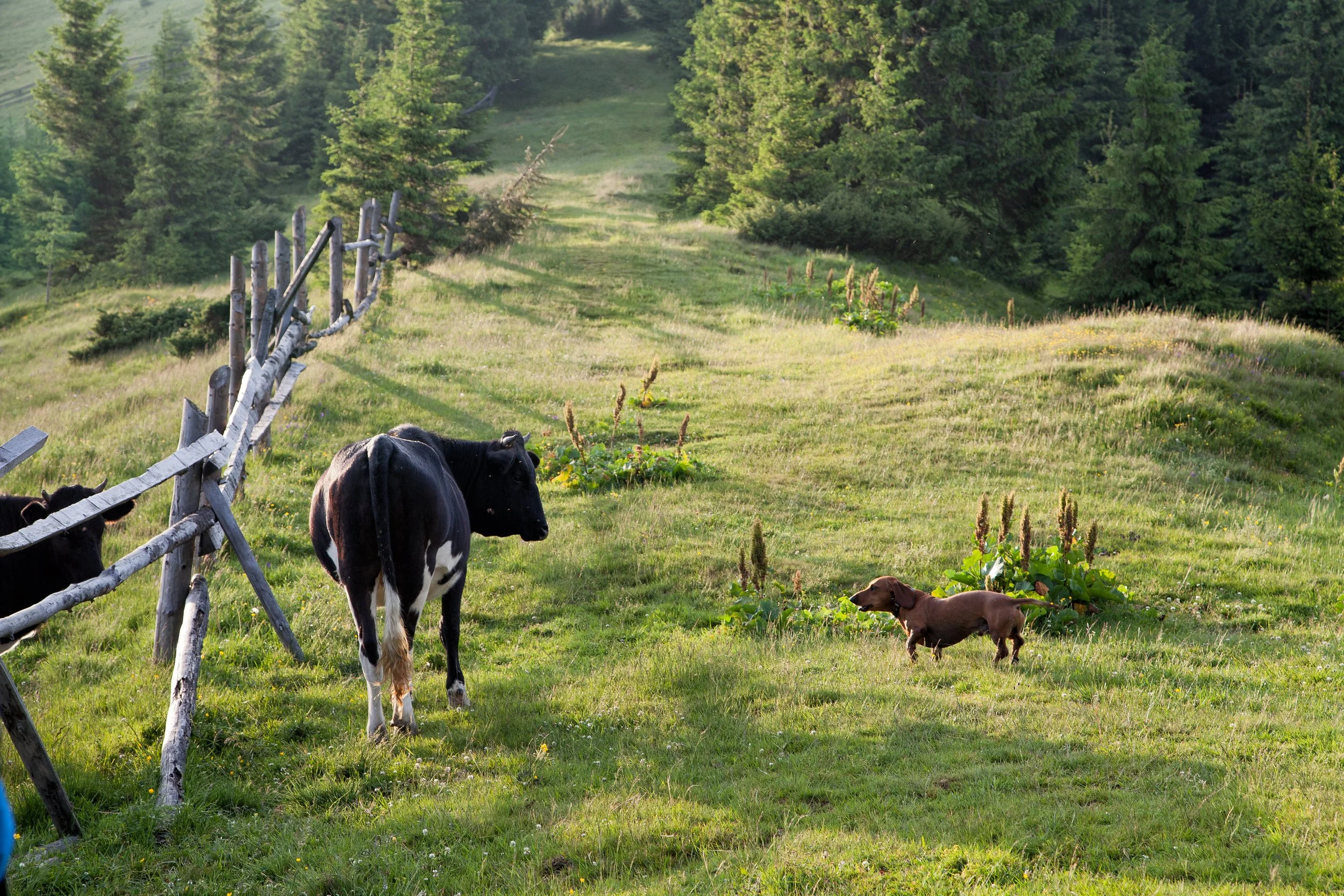Sometimes there would be lots of cows in the fields and the older dog would bark at them and they would back off and disperse. However, the younger, more energetic dog, would always run behind me when the cows came near and if the older dog was away. The young pup knew that if I yelled at the cows they would not come near and we could walk through them unperturbed.